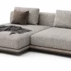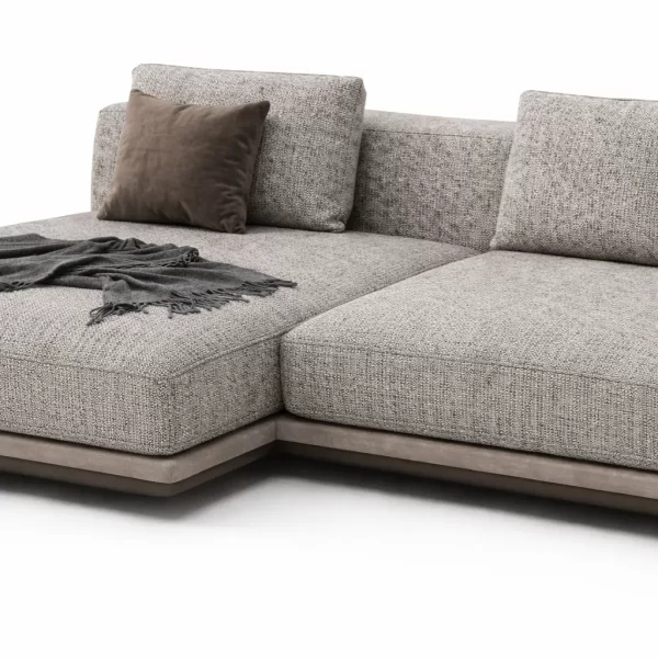 This sofa features a low-profile, modern sectional design upholstered in a soft beige fabric. It includes wide, generously cushioned seats and a left-side chaise extension, all set on a sleek wooden platform base that subtly frames the structure. The backrest is clean and structured, complemented by matching beige back cushions and two darker accent pillows. A dark throw blanket is casually draped over the chaise, enhancing its cozy yet minimalist aesthetic.