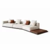 This sofa features a sleek, low-profile modular design with clean lines and a minimalist aesthetic. Upholstered in soft cream fabric, it includes generously sized seat and back cushions for a relaxed, contemporary feel. Neutral and warm rust accent pillows add subtle contrast, while an extended wooden platform on one end provides a built-in side surface, enhancing both functionality and modern appeal.